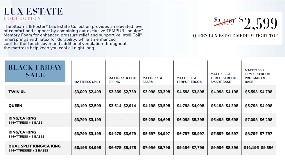 The Stearns & Foster Lux Estate Collection provides and elevated level of comfort and support by combining exclusive Tempur-INduleg Memory Foam for enhanced pressure relief and supportive IntelliCoil innersprings with latex for durability while enhanced cool-to-the-touch cover and additional ventilation throughout the mattress help keep you cool all night long.