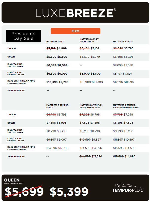 Home / Mattresses / Tempur-pedic / Tempur-LuxeBreeze Firm 2.0 Click here to enlarge Click here to enlarge Click here to enlarge Click here to enlarge On Sale Tempur-Pedic Tempur-LuxeBreeze Firm 2.0 Was: $5,199.00 Now: $4,899.00 Tempur-LuxeBreeze Firm 2.0 10 YEAR FULL REPLACEMENT LIMITED WARRANTY Full Description Add to wishlist Create Wishlist * Make wishlist public Description Information Reviews Share Share on Facebook Share by email Print this page Tempur-LuxeBreeze Firm 2.0 10 YEAR FULL REPLACEMENT LIMITED WARRANTY Current Stock: Weight: 96.00 LBS Customer Reviews 0 (0 Reviews) Write a Review Sorry, there are no reviews for this product yet. Related Products On Sale Quick View Tempur-Pedic Tempur-LuxeBreeze Medium Hybrid 2.0 Was: $5,199.00 Now: $4,899.00 On Sale Quick View Tempur-Pedic Tempur-ProAdapt Firm 2.0 Was: $2,899.00 Now: $2,699.00 On Sale Quick View Tempur-Pedic Tempur-ProAdapt Medium 2.0 Was: $2,899.00 Now: $2,699.00