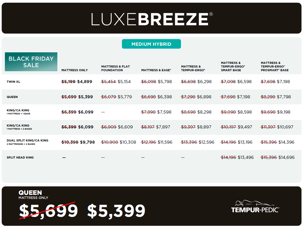 Home / Mattresses / Tempur-pedic / Tempur-LuxeBreeze Medium Hybrid 2.0 Click here to enlarge Click here to enlarge Click here to enlarge Click here to enlarge Click here to enlarge On Sale Tempur-Pedic Tempur-LuxeBreeze Medium Hybrid 2.0 Was: $5,199.00 Now: $4,899.00 Tempur-LuxeBreeze Firm 2.0 10 YEAR FULL REPLACEMENT LIMITED WARRANTY Full Description Add to wishlist Create Wishlist * Make wishlist public Description Information Reviews Share Share on Facebook Share by email Print this page Tempur-LuxeBreeze Firm 2.0 10 YEAR FULL REPLACEMENT LIMITED WARRANTY Current Stock: Weight: 96.00 LBS Customer Reviews 0 (0 Reviews) Write a Review Sorry, there are no reviews for this product yet. Related Products On Sale Quick View Tempur-Pedic Tempur-LuxeBreeze Firm 2.0 Was: $5,199.00 Now: $4,899.00 On Sale Quick View Tempur-Pedic Tempur-Pedic Adapt HYBRID 2.0 Medium Was: $1,999.00 Now: $1,799.00 On Sale Quick View Tempur-Pedic Tempur-ProAdapt Hybrid 2.0 Was: $2,899.00 Now: $2,699.00