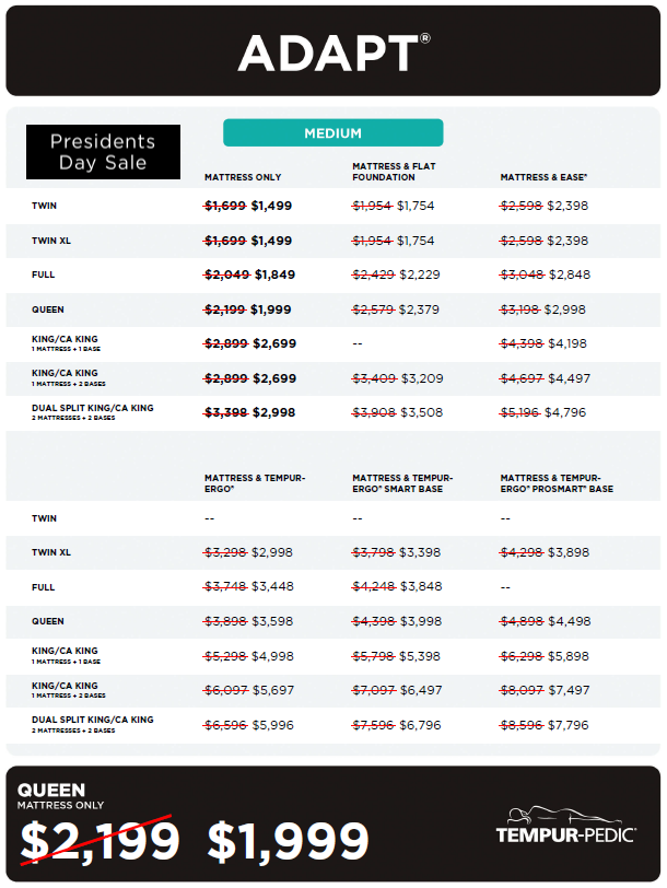 Home / Mattresses / Tempur-pedic / Tempur-Adapt / Tempur-Pedic Adapt 2.0 Medium Click here to enlarge Click here to enlarge Click here to enlarge Click here to enlarge On Sale Tempur-Pedic Tempur-Pedic Adapt 2.0 Medium Was: $1,699.00 Now: $1,499.00 Tempur-Pedic ADAPT 2.0 Medium 10 YEAR FULL REPLACEMENT LIMITED WARRANTY Full Description Add to wishlist Create Wishlist * Make wishlist public Description Information Reviews Share Share on Facebook Share by email Print this page Tempur-Pedic ADAPT 2.0 Medium 10 YEAR FULL REPLACEMENT LIMITED WARRANTY Current Stock: Weight: 96.00 LBS Customer Reviews 0 (0 Reviews) Write a Review Sorry, there are no reviews for this product yet. Related Products On Sale Quick View Tempur-Pedic Tempur-Pedic Adapt HYBRID 2.0 Medium Was: $1,999.00 Now: $1,799.00 On Sale Quick View Tempur-Pedic Tempur-ProAdapt Medium 2.0 Was: $2,899.00 Now: $2,699.00 On Sale Quick View Tempur-Pedic Tempur-LuxeBreeze Medium Hybrid 2.0 Was: $5,199.00 Now: $4,899.00